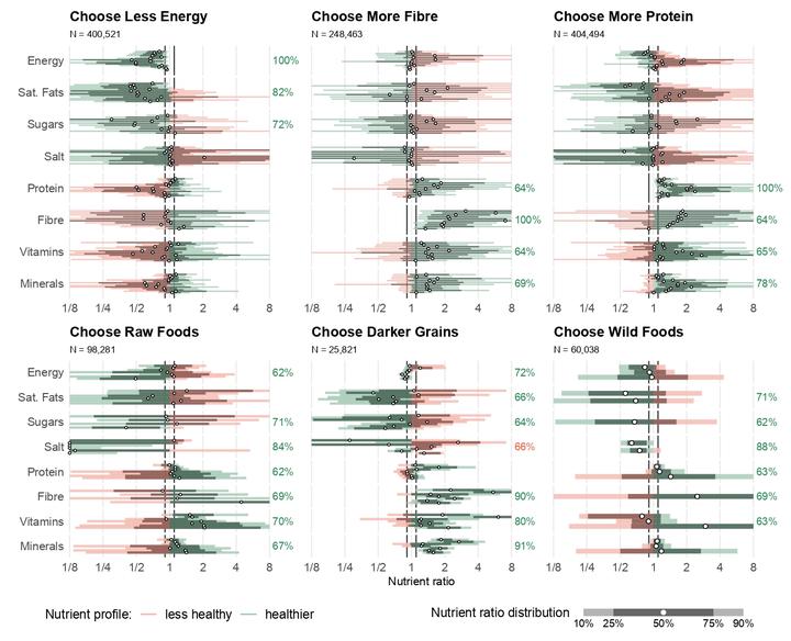Food choices involve many nutritional dimensions at once. To reduce this complexity, people often rely on heuristics (i.e. simple decision rules) such as choosing products with less sugar or less fat. The study systematically tests a range of single-cue heuristics using large dataset of nutrient densities in food products.